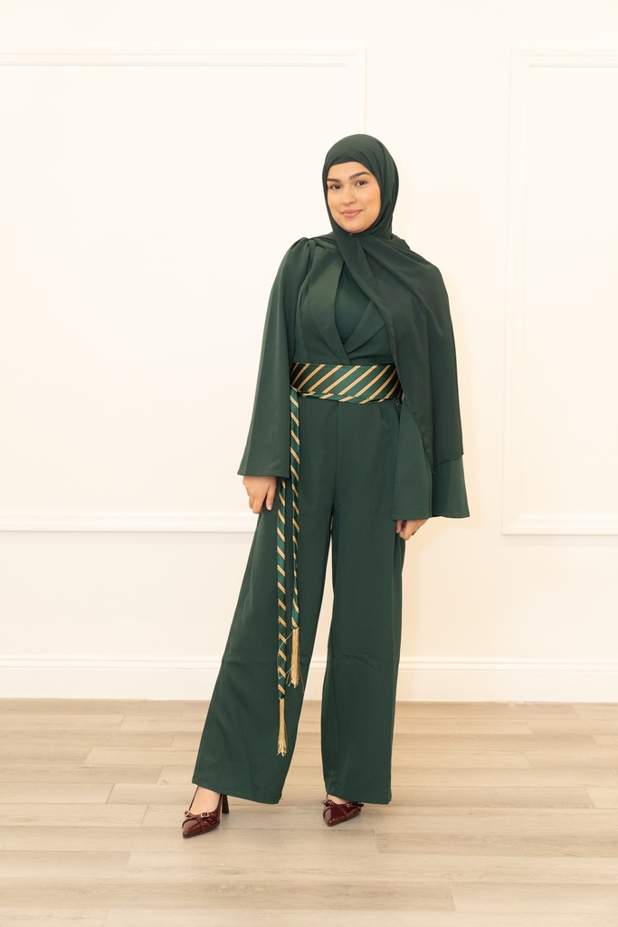 This outfit comes as a complete set, featuring a green jumpsuit, a matching belt, and an underbody in the same color, creating a perfectly coordinated look. The belt, handmade in Palestine from luxurious Cashmere fabric, is enhanced with a touch of fringe, adding a modern twist.